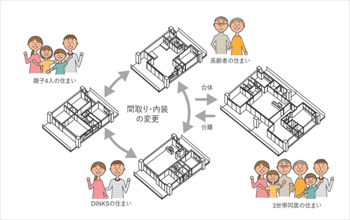 100年以上使い続けることができる丈夫な建物の骨格となるスケルトン(構造躯体)と、生活に合わせて間取りを自由に変えられるインフィル(住戸・内装部分)に分けて、考えられた住まいです。