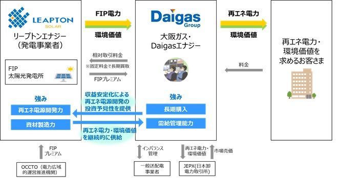 大阪ガス株式会社(代表取締役社長:藤原 正隆、以下「大阪ガス」)とリープトンエナジー株式会社(代表取締役:周 鳴飛、以下「リープトンエナジー」)は、リープトンエナジーが開発・保有する「FIP(Feed-in Premium)制度」を活用した複数の太陽光発電所(以下「FIP発電所」)に由来する電力・環境価値について、大阪ガスが相対取引により長期買取する契約を、本日締結しました。年間5,000kW以上を目標として、両者は継続的な再生可能エネルギー(以下「再エネ」)電源開発・活用を目指します。