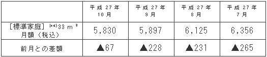 | 大阪ガス株式会社(社長:本荘 武宏)は、平成27年10月検針分の一般ガス供給約款料金および選択約款料金に適用する単位料金を平成27年9月検針分に比べて1m3につきマイナス2.01円(税込)調整させていただきます。これは、原料費調整制度に基づく平成27年5月~7月の平均原料価格(56,010円/トン)による調整です。この調整により標準家庭で1ヶ月につき67円(税込)ガス料金が下がります。 | ||||||||||||||||||