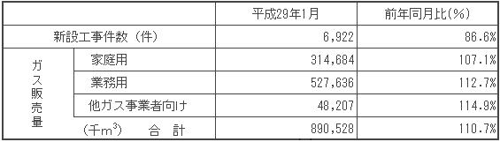 家庭用ガス販売量は、気水温が前年に比べ低く推移し給湯・暖房需要が増加したことなどにより、前年同月比7.1%増の3億1千5百万m3となりました。