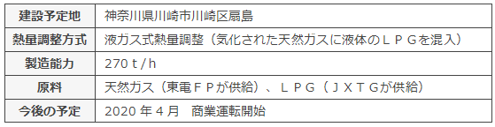| 新会社は、東電FPの東扇島LNG基地に隣接する東電FP所有地において、都市ガスを製造するための熱量調整設備を建設・保有し、2020年4月から主に東電FPの品川火力発電所へ、託送により都市ガス供給を開始することを目指します。 |