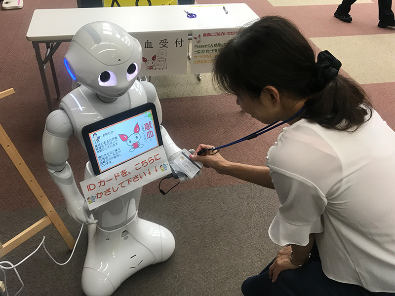 当日は、障がいをお持ちの方が、ぷろぼのさまの作業所からパソコンを通じてPepperを操作。 献血に訪れた人に近づいてあいさつをしたり、会場内での誘導を行うなどの業務を行いました!