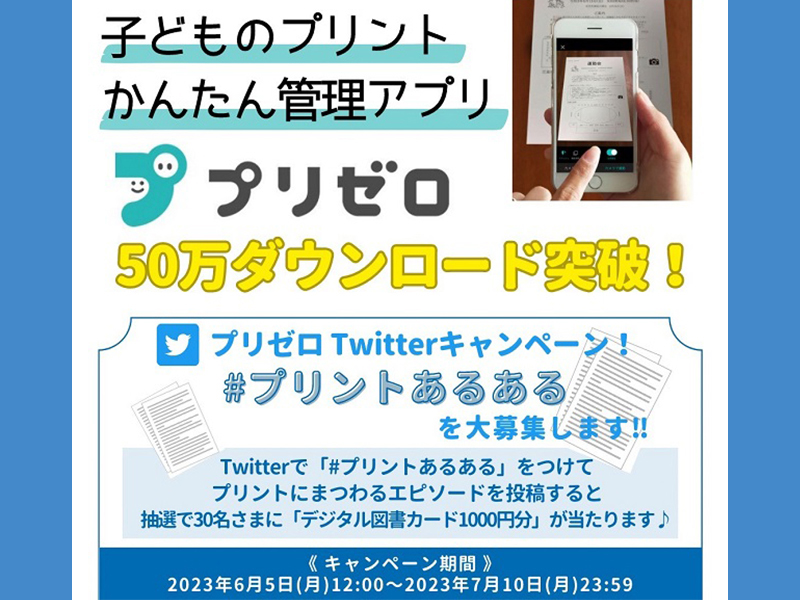 プリントをパシャっと撮影するだけで簡単にプリント管理ができるスマートフォンアプリ「プリゼロ」が、皆さまのおかげで50万ダウンロードを突破しました!「プリゼロ」Twitter公式アカウントでは現在、抽選で30名さまにデジタル図書カードが当たるキャンペーンを実施しています。