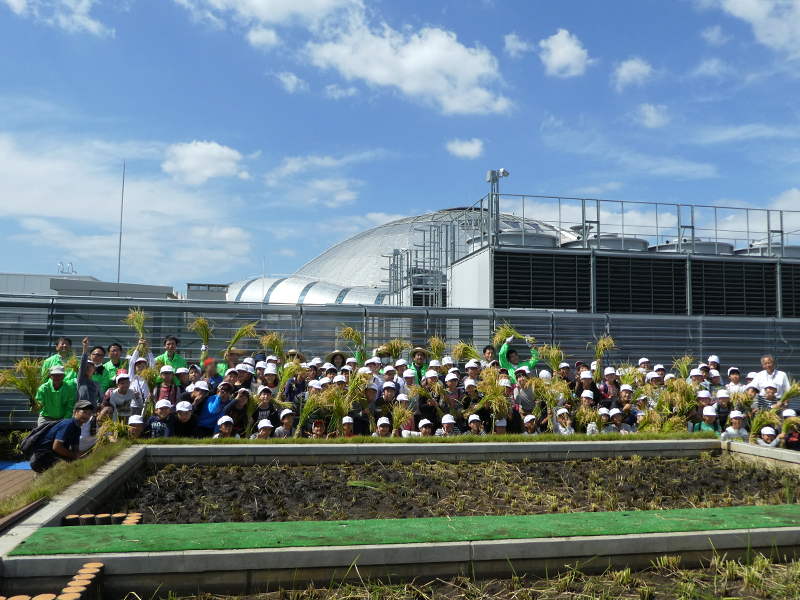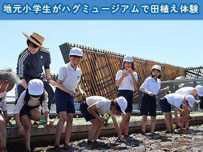 小学生がハグミュージアム屋上で田植えに挑戦!