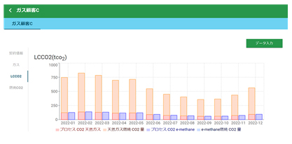 今回、PoCの一環として構築した本システムでは、各プラントで製造されたe-methane・天然ガスが需要家に供給される過程においてCO2排出量が可視化できる機能を構築しました(図2)。また、e-methaneの環境価値の取引を想定し、事業者毎の環境価値残高の表示や、取引の依頼・承認を行う機能を構築しました(図3)。