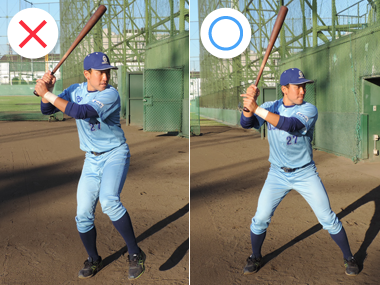 右打者の場合、左足を上げると、体が上下に動き、目線もぶれてしまいます。肩幅より少し広めに足を広げ、膝を曲げて腰を落として構え、足を上げずにバットを振りましょう。
