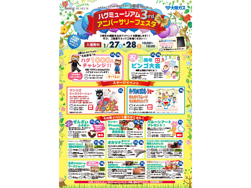大阪ガスのショールーム 「 hu+gMUSEUM(ハグミュージアム)」 は、1月30日に3周年を迎えます♪ 皆さま、いつもご来館ありがとうございます。3周年の感謝を込めて、1月27日(土)・28日(日)に 「 ハグミュージアム3rdアニバーサリーフェスタ 」 を開催します!
